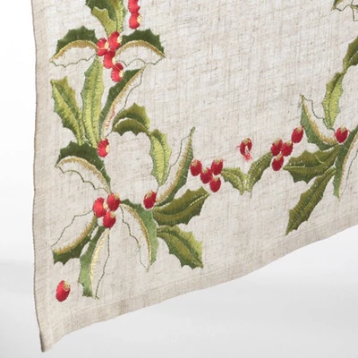 Add a festive touch to your holiday table with this gorgeous embroidered holly table runner. Featuring a traditional theme and classic Christmas colors, it’s easy to coordinate with any holiday decor or create a coordinated look with the matching table napkins if desired. The design can be dressed up for special dinners or kept casual for family gatherings.