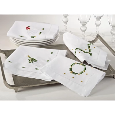 Renew your holiday tabletop with these charming Hemstitched Holiday Table Napkins. Crafted with a linen and cotton blend, this stylish set is a beautiful addition to your holiday décor. The design features traditional Christmas motifs, which makes it easy to pair with a Christmas Table Runner or embroidered tablecloth to create a stunning set.