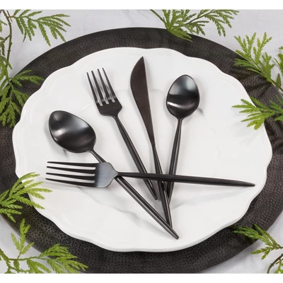 Supremely sleek and effortlessly chic, this Black Stainless Steel Flatware Set adds a unique look and feel to your tabletop décor. The minimal style allows you to coordinate with a wide assortment of dinnerware and table linens for versatility and range. Whether within a rustic setting, or modern and contemporary, this flatware feels right at home and helps transform any dining experience into a special and memorable occasion.